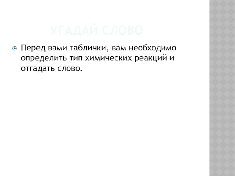 Угадай словоПеред вами таблички, вам необходимо определить тип химических реакций и отгадать