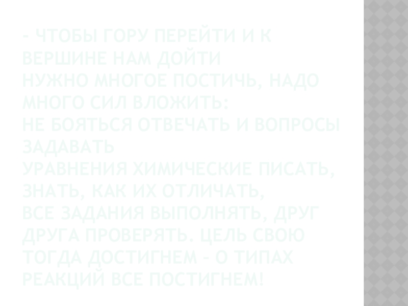 надо много сил вложить: не бояться отвечать и вопросы задавать уравнения химические писать, знать, как их отличать, Все задания выполнять, друг друга проверять. Цель свою тогда достигнем – О типах реакций все постигнем!