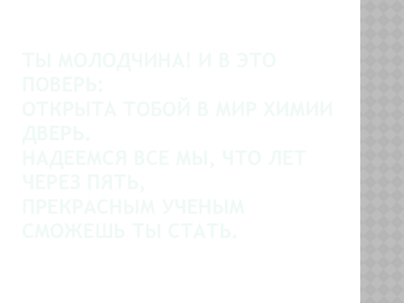 Слайд 12Ты молодчина! И в это поверь: Открыта тобой в мир химии дверь. Надеемся