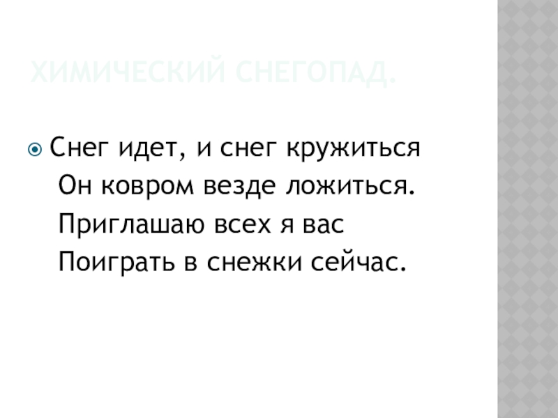 Химический снегопад.Снег идет, и снег кружиться  Он ковром везде ложиться.  Приглашаю всех я вас