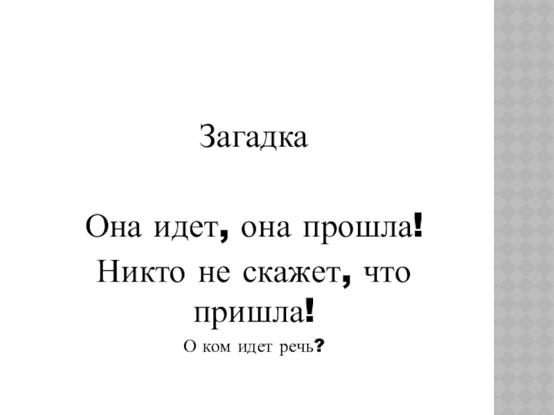 ЗагадкаОна идет, она прошла!Никто не скажет, что пришла!О ком идет речь?