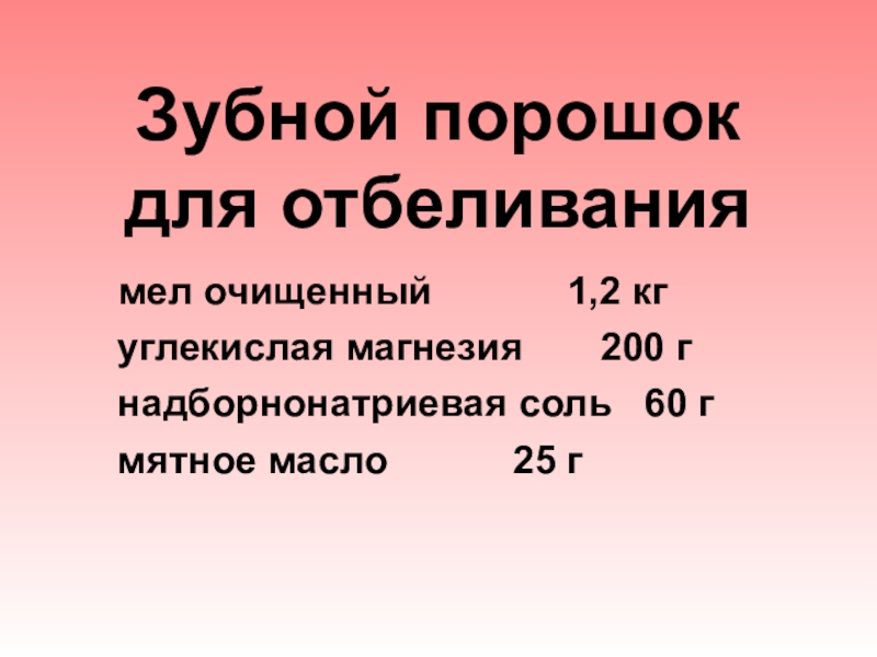 Зубной порошок для отбеливания	мел очищенный 			 1,2 кг  углекислая магнезия 		200 г  надборнонатриевая соль	60