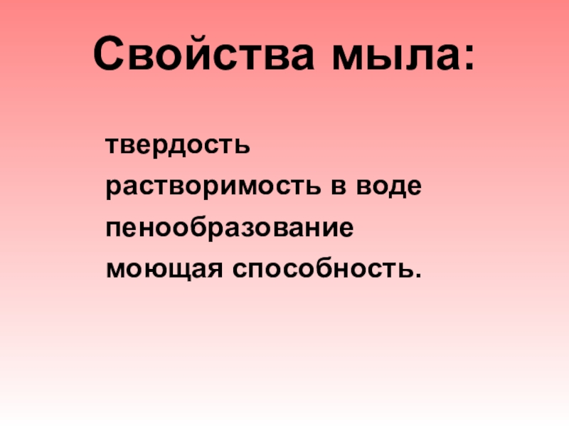 Свойства мыла: 	твердость	растворимость в воде	пенообразование	моющая способность.