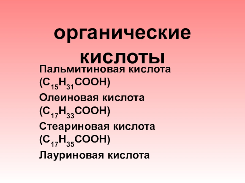 органические кислотыПальмитиновая кислота (С15Н31СООН) Олеиновая кислота (С17Н33СООН) Стеариновая кислота (С17Н35СООН) Лауриновая кислота