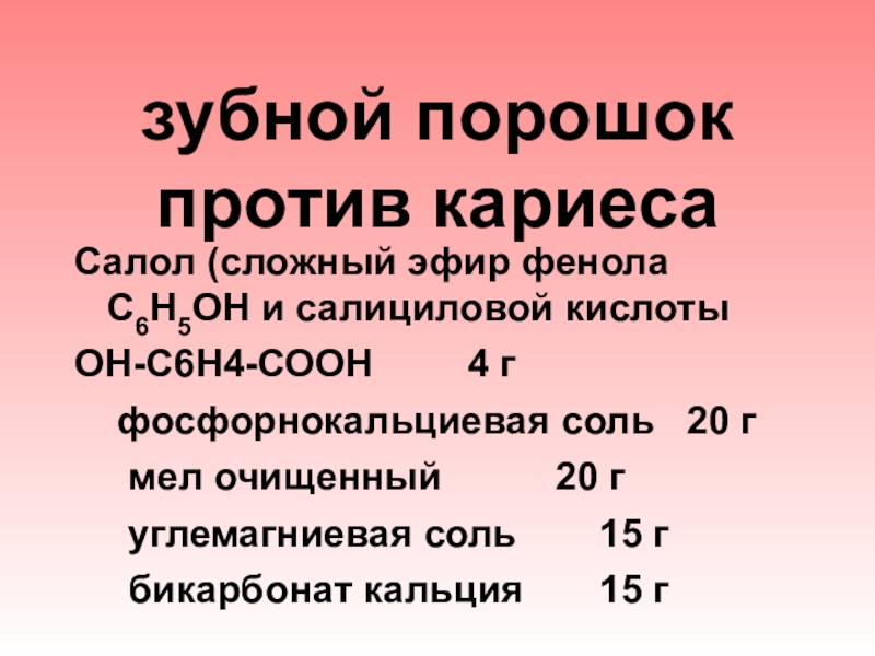 зубной порошок против кариесаСалол (сложный эфир фенола С6Н5ОН и салициловой кислоты ОН-С6Н4-СООН			4 г  фосфорнокальциевая соль