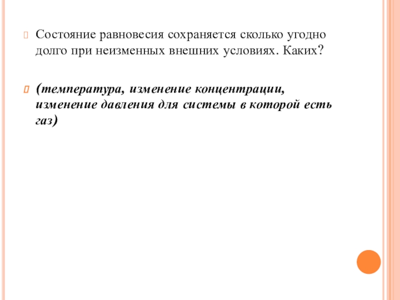 Слайд 13Состояние равновесия сохраняется сколько угодно долго при неизменных внешних условиях. Каких?