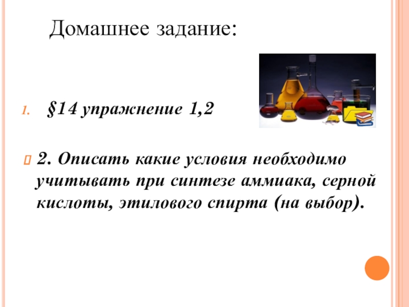 §14 упражнение 1,22. Описать какие условия необходимо учитывать при синтезе аммиака, серной кислоты, этилового спирта (на выбор).Домашнее