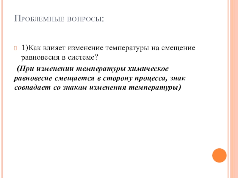 Проблемные вопросы:  1)Как влияет изменение температуры на смещение равновесия в системе? (При изменении температуры химическое равновесие