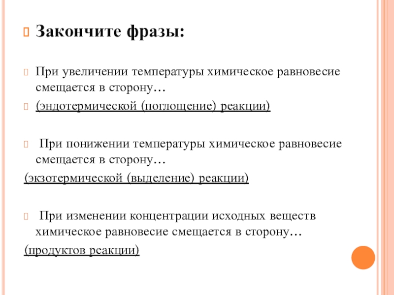 Закончите фразы:При увеличении температуры химическое равновесие смещается в сторону…(эндотермической (поглощение) реакции) При понижении температуры химическое равновесие смещается