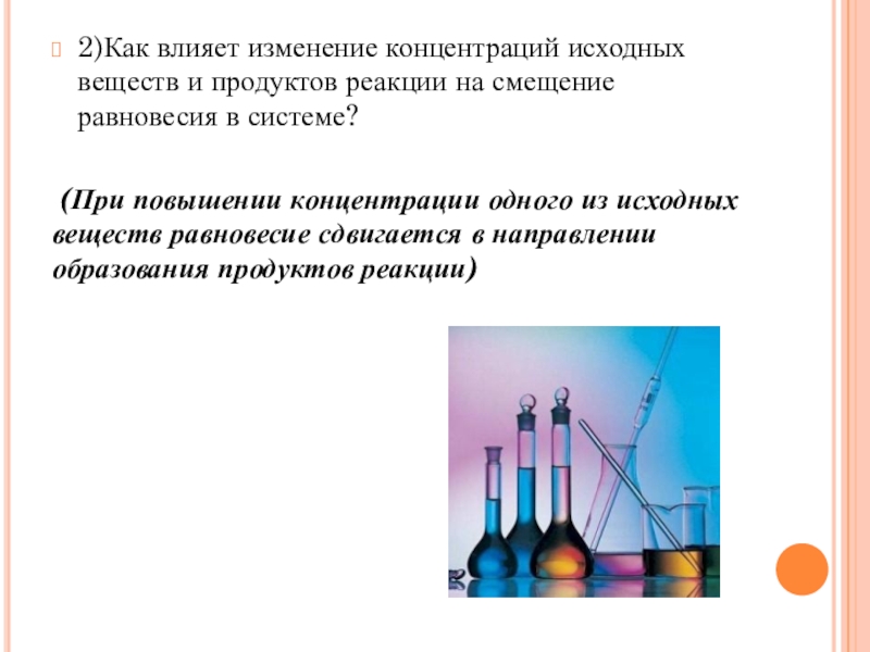 2)Как влияет изменение концентраций исходных веществ и продуктов реакции на смещение равновесия в системе? (При повышении концентрации