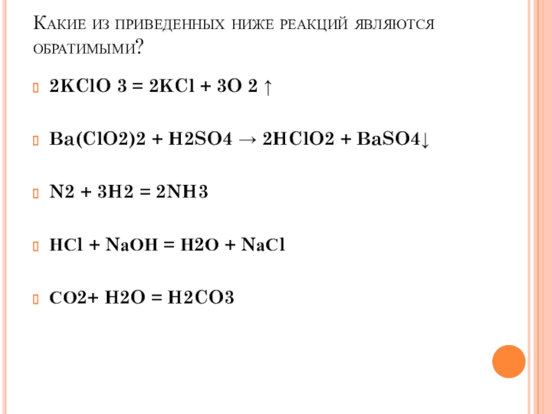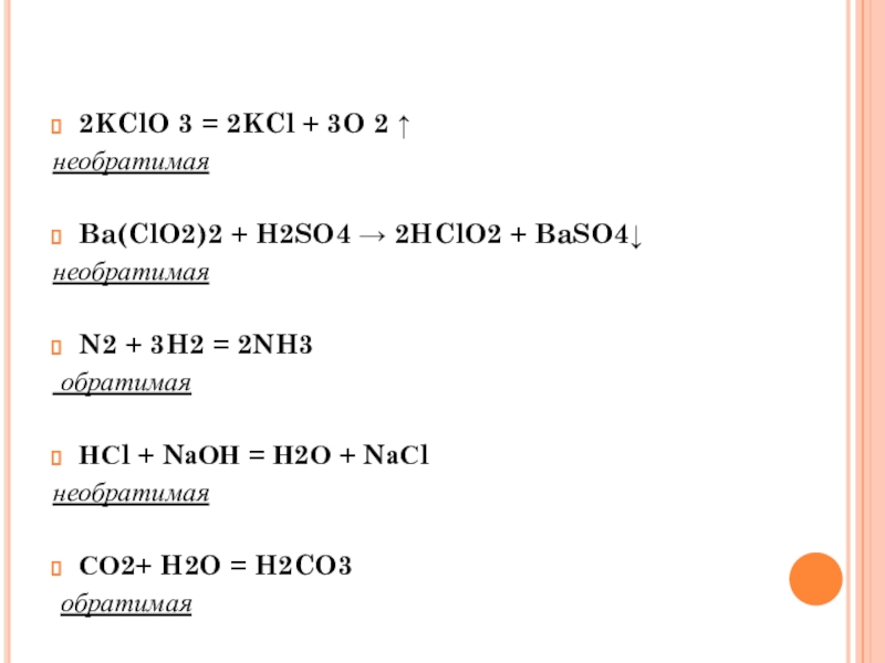 2KClO 3 = 2KCl + 3O 2 ↑ необратимаяBa(ClO2)2 + H2SO4 → 2HClO2 + BaSO4↓необратимаяN2 + 3H2