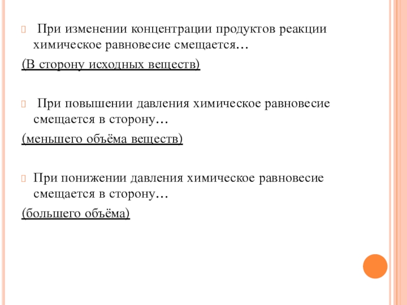 Слайд 19 При изменении концентрации продуктов реакции химическое равновесие смещается…