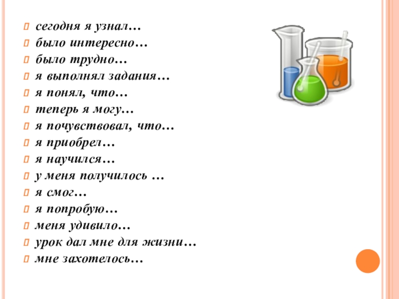 сегодня я узнал…было интересно…было трудно…я выполнял задания…я понял, что…теперь я могу…я почувствовал, что…я приобрел…я научился…у меня получилось