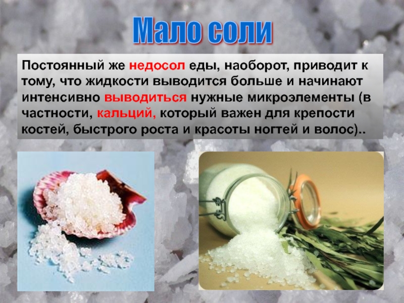 Мало соли Постоянный же недосол еды, наоборот, приводит к тому, что жидкости выводится больше и начинают интенсивно