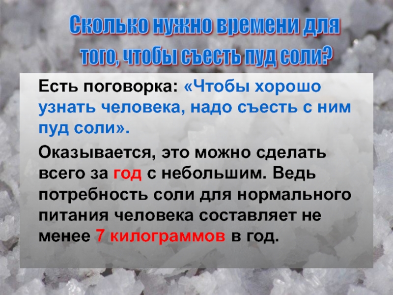 Есть поговорка: «Чтобы хорошо узнать человека, надо съесть с ним пуд соли».  Оказывается, это