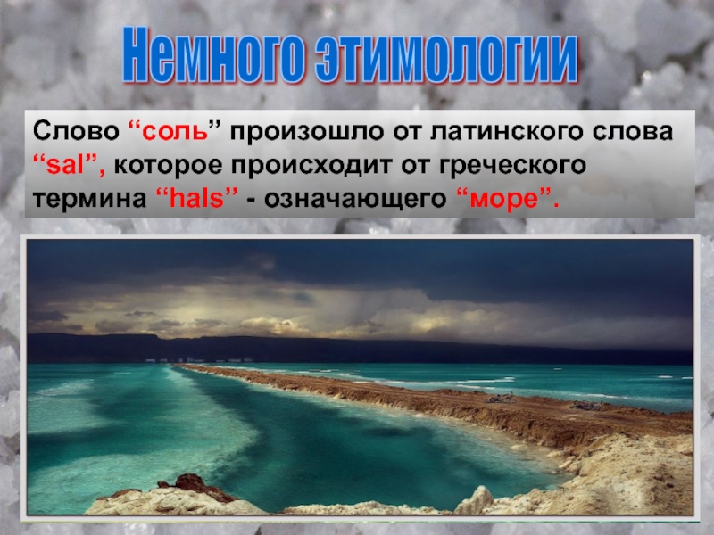 Слово “соль” произошло от латинского слова “sal”, которое происходит от греческого термина “hals” - означающего “море”.Немного этимологии