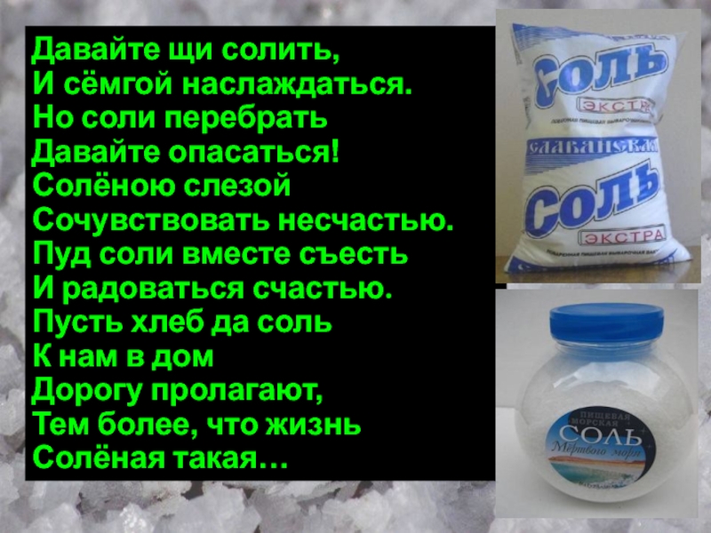 Давайте щи солить, И сёмгой наслаждаться.Но соли перебратьДавайте опасаться!Солёною слезой Сочувствовать несчастью.Пуд соли вместе съестьИ радоваться счастью.Пусть