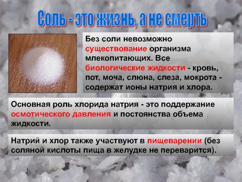 Соль - это жизнь, а не смерть Без соли невозможно существование организма млекопитающих. Все биологические жидкости -