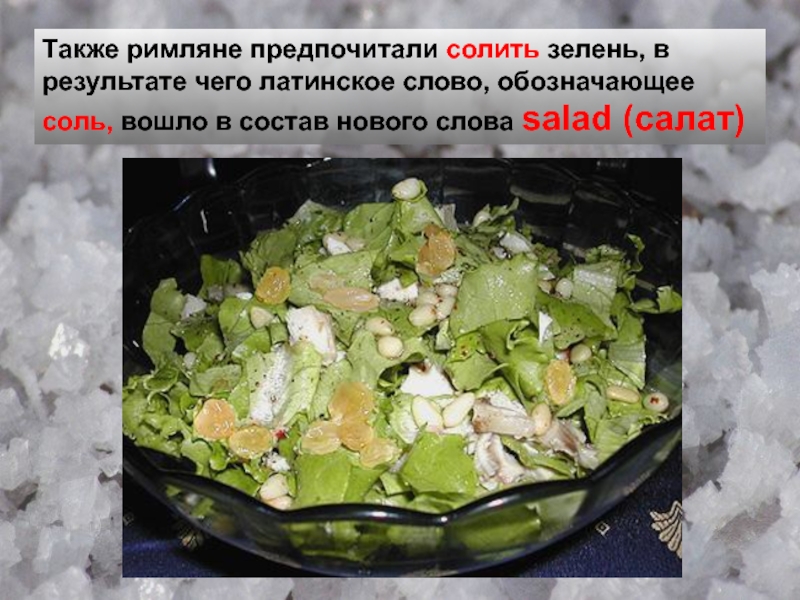 Слайд 8Также римляне предпочитали солить зелень, в результате чего латинское слово, обозначающее