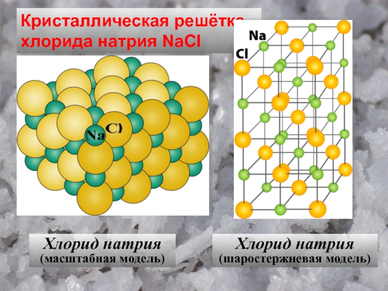 Хлорид натрия (масштабная модель)Хлорид натрия (шаростержневая модель)Кристаллическая решётка хлорида натрия NaCl