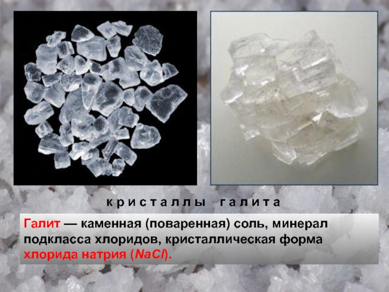 Галит — каменная (поваренная) соль, минерал подкласса хлоридов, кристаллическая форма хлорида натрия (NaCl).