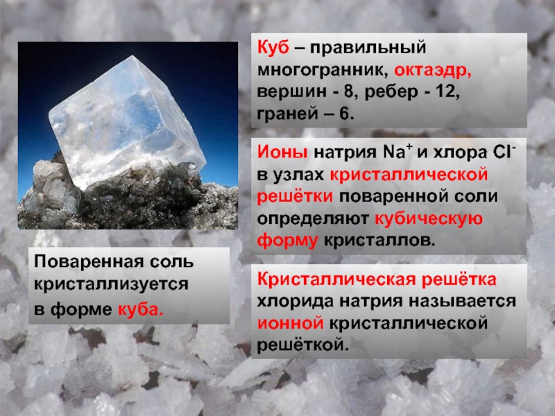 Поваренная соль кристаллизуетсяв форме куба.Куб – правильный многогранник, октаэдр, вершин - 8, ребер - 12, граней –