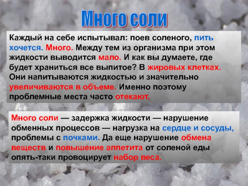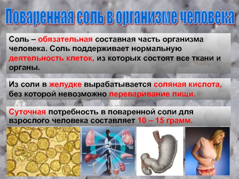 человека. Соль поддерживает нормальную деятельность клеток, из которых состоят все ткани и органы.