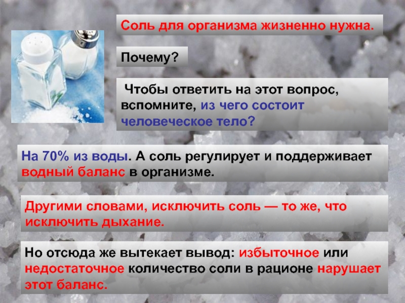 Соль для организма жизненно нужна. Почему? Чтобы ответить на этот вопрос, вспомните, из чего состоит человеческое тело?