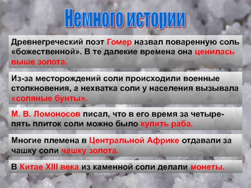 Древнегреческий поэт Гомер назвал поваренную соль «божественной». В те далекие времена она ценилась выше золота.Немного истории Из-за