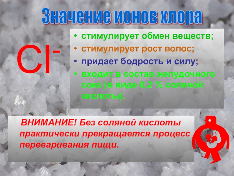 Натрий и хлор также участвуют в пищеварении (без соляной кислоты пища в желудке не переварится).