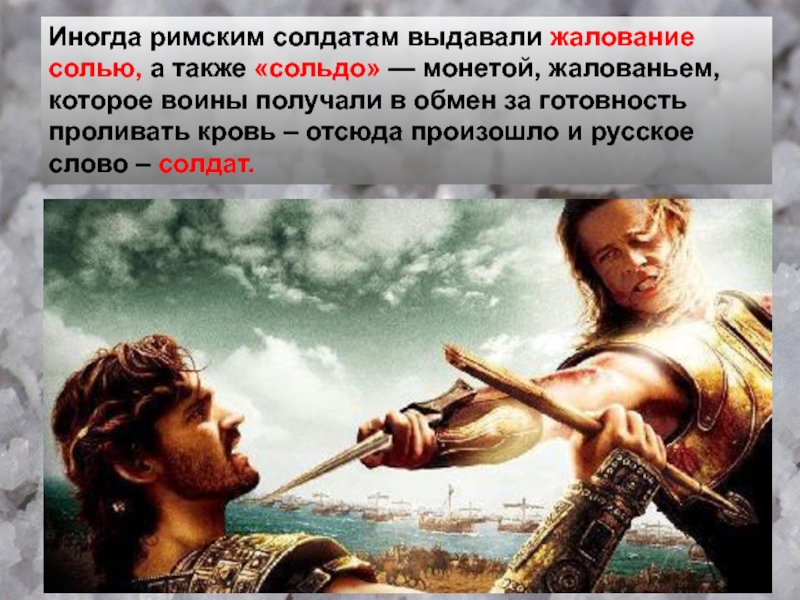 Иногда римским солдатам выдавали жалование солью, а также «сольдо» — монетой, жалованьем, которое воины получали в обмен