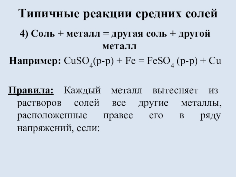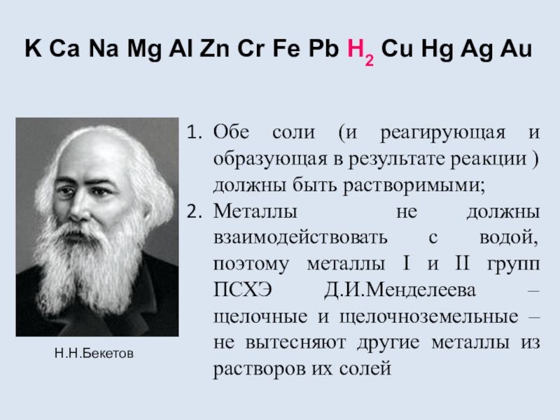 Металлы не должны взаимодействовать с водой, поэтому металлы Ι и ΙΙ групп ПСХЭ Д.И.Менделеева – щелочные и щелочноземельные – не вытесняют другие металлы из растворов их солей