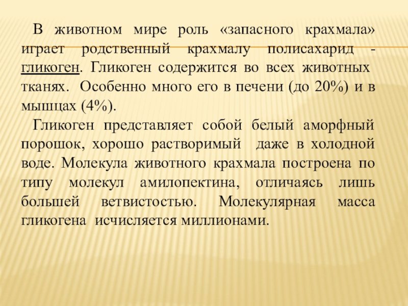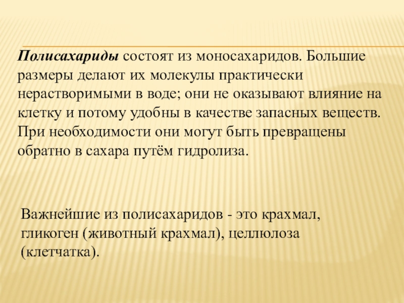 Важнейшие из полисахаридов - это крахмал, гликоген (животный крахмал), целлюлоза (клетчатка).