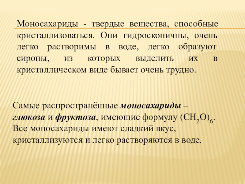 Моносахариды - твердые вещества, способные кристаллизоваться. Они гидроскопичны, очень легко растворимы в воде, легко образуют сиропы, из которых выделить их в кристаллическом виде бывает очень трудно.