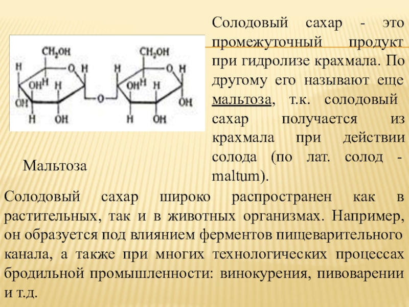 Солодовый сахар широко распространен как в растительных, так и в животных организмах. Например, он образуется под влиянием ферментов пищеварительного канала, а также при многих технологических процессах бродильной промышленности: винокурения, пивоварении и т.д.