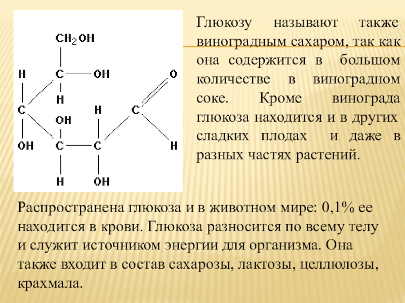 Распространена глюкоза и в животном мире: 0,1% ее находится в крови. Глюкоза разносится по всему телу и служит источником энергии для организма. Она также входит в состав сахарозы, лактозы, целлюлозы, крахмала.