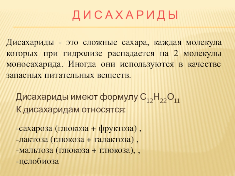 Дисахариды - это сложные сахара, каждая молекула которых при гидролизе распадается на 2 молекулы моносахарида. Иногда они используются в качестве запасных питательных веществ.