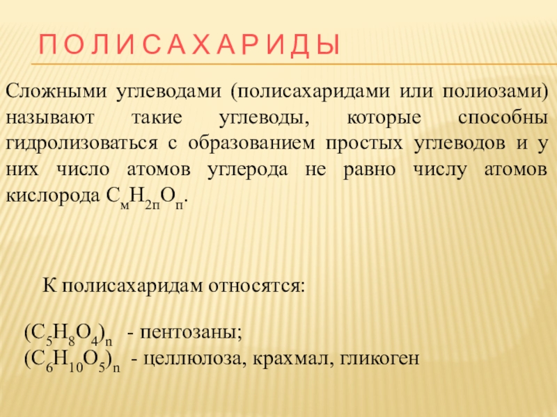 Сложными углеводами (полисахаридами или полиозами) называют такие углеводы, которые способны гидролизоваться с образованием простых углеводов и у них число атомов углерода не равно числу атомов кислорода СмН2пОп.