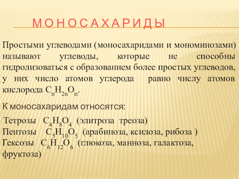 Простыми углеводами (моносахаридами и мономинозами) называют углеводы, которые не способны гидролизоваться с образованием более простых углеводов, у них число атомов углерода равно числу атомов кислорода СпН2nОп.