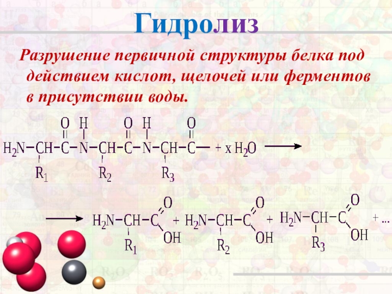 Гидролиз  Разрушение первичной структуры белка под действием кислот, щелочей или ферментов в присутствии воды.