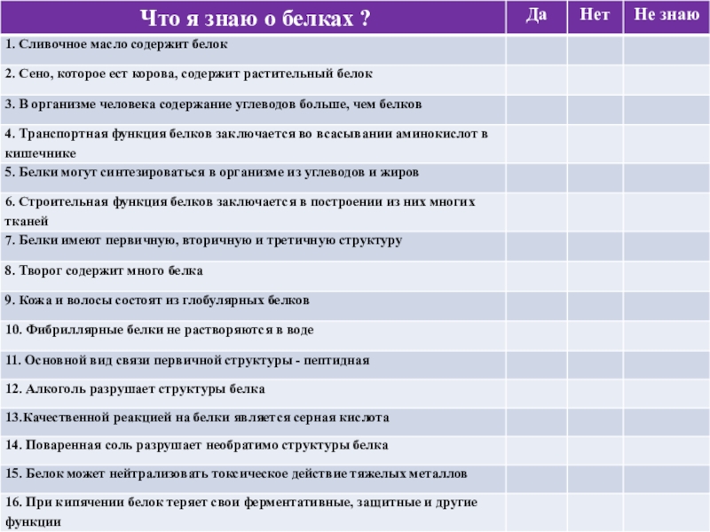 Цель урока: Изучить химические свойства белковПлан:1. Исследовать влияние на белковые молекулы действия различных факторов и химических веществ.2.