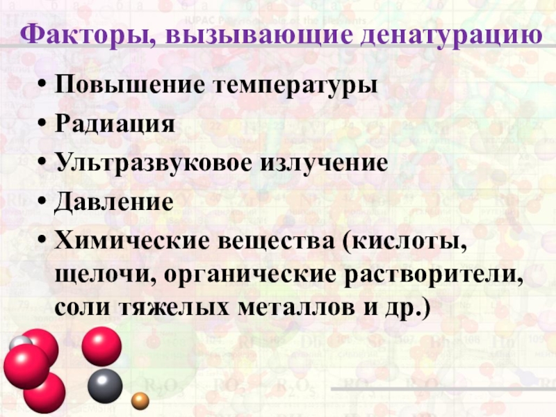 Факторы, вызывающие денатурациюПовышение температурыРадиацияУльтразвуковое излучениеДавлениеХимические вещества (кислоты, щелочи, органические растворители,  соли тяжелых металлов и др.)