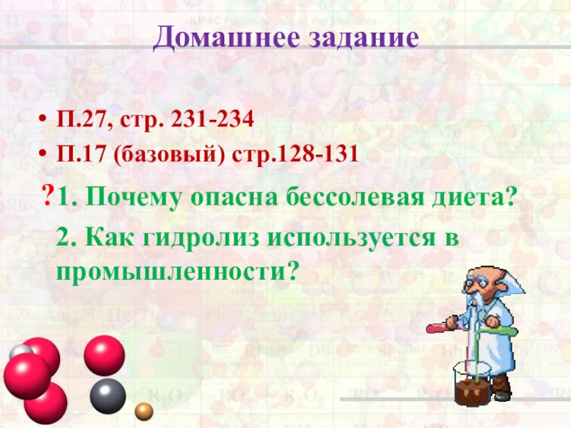 Домашнее заданиеП.27, стр. 231-234П.17 (базовый) стр.128-131 ?1. Почему опасна бессолевая диета?  2. Как гидролиз используется в
