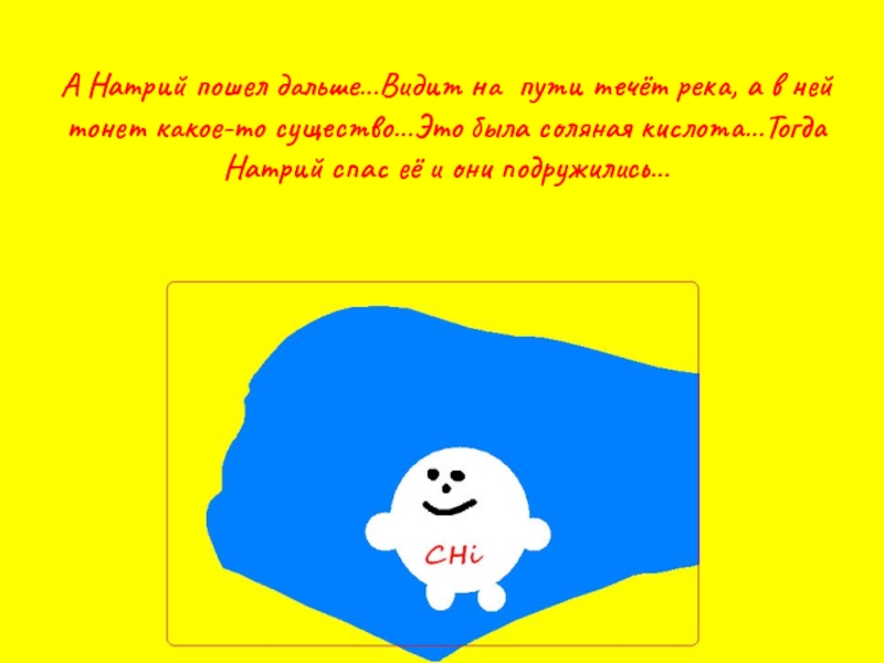А Натрий пошел дальше…Видит на пути течёт река, а в ней тонет какое-то существо…Это была соляная кислота…Тогда