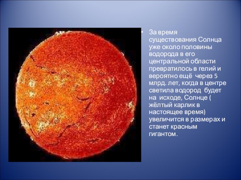 области превратилось в гелий и вероятно ещё через 5 млрд. лет, когда в центре светила водород будет на исходе, Солнце ( жёлтый карлик в настоящее время) увеличится в размерах и станет красным гигантом.