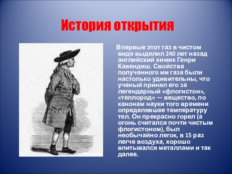 240 лет назад английский химик Генри Кавендиш. Свойства полученного им газа были настолько удивительны, что ученый принял его за легендарный «флогистон», «теплород» — вещество, по канонам науки того времени определявшее температуру тел. Он прекрасно горел (а огонь считался почти чистым флогистоном), был необычайно легок, в 15 раз легче воздуха, хорошо впитывался металлами и так далее.