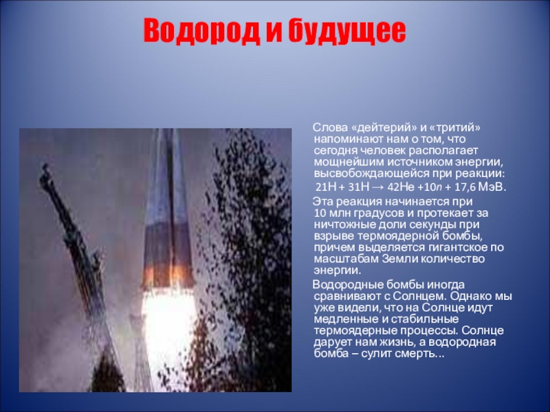 горами, – когда мерилом ценности станет не золото, а энергия. И тогда изотопы водорода спасут человечество от надвигающегося энергетического голода: в управляемых термоядерных процессах каждый литр природной воды будет давать столько же энергии, сколько ее дают сейчас 300 л бензина. И человечество будет с недоумением вспоминать, что было время, когда люди угрожали друг другу животворным источником тепла и света...