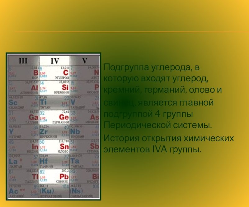 Подгруппа углерода, в которую входят углерод, кремний, германий, олово и