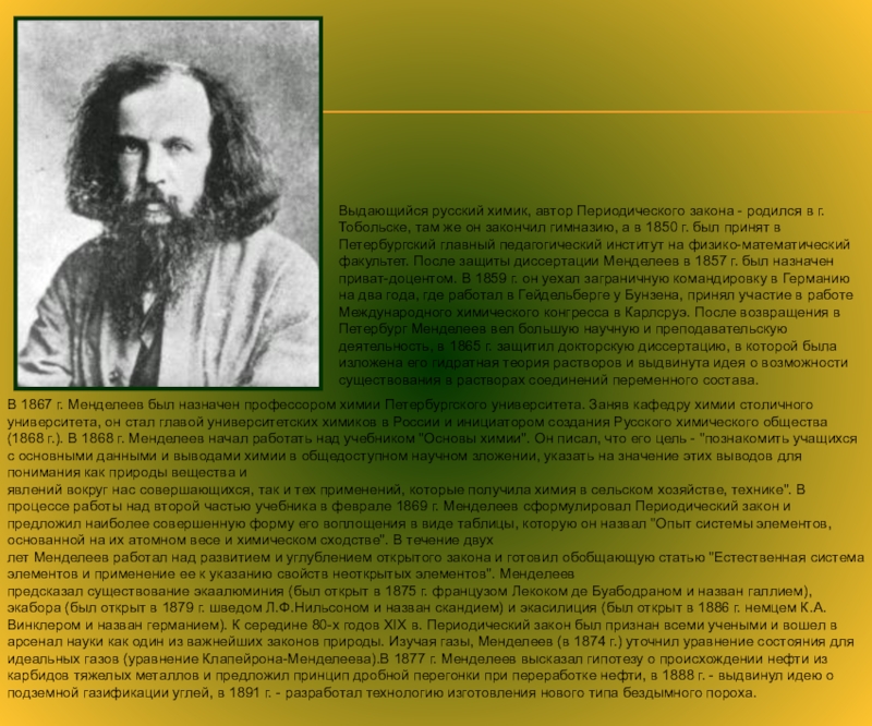 на два года, где работал в Гейдельберге у Бунзена, принял участие в работе Международного химического конгресса в Карлсруэ. После возвращения в Петербург Менделеев вел большую научную и преподавательскую деятельность, в 1865 г. защитил докторскую диссертацию, в которой была изложена его гидратная теория растворов и выдвинута идея о возможности