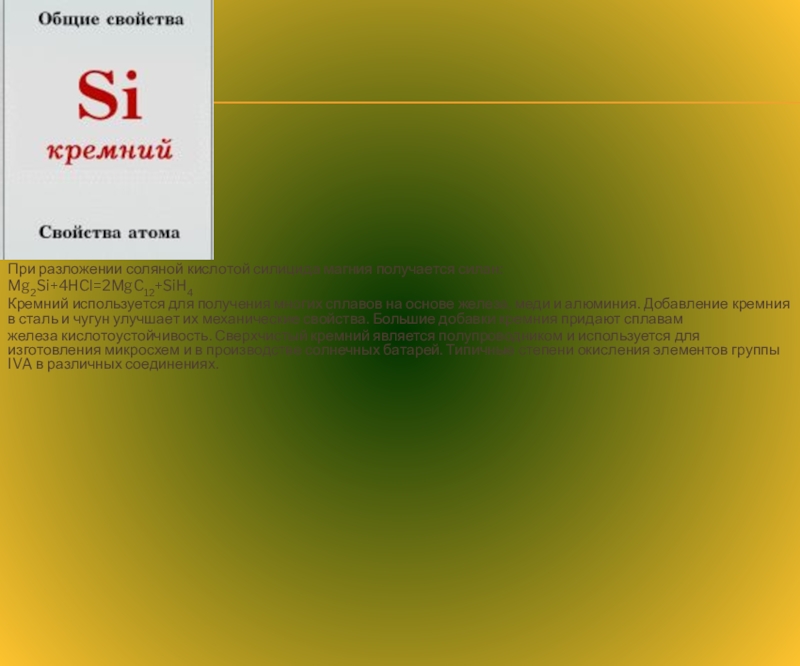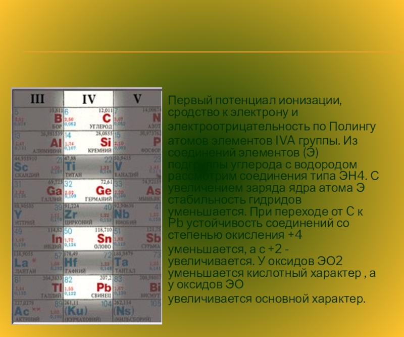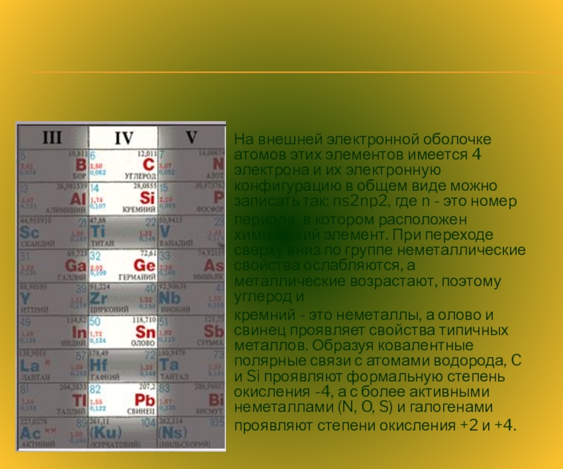 кремний - это неметаллы, а олово и свинец проявляет свойства типичных металлов. Образуя ковалентные полярные связи с атомами водорода, C и Si проявляют формальную степень окисления -4, а с более активными неметаллами (N, O, S) и галогенами